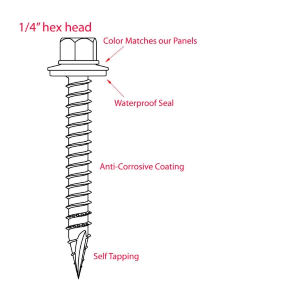 Metal to Wood self tamping screws with weatherproof seal. Screw head is perfectly color matched toMBS panels and trim. Designed to attach panel/trim to a WOOD frame. Sold in 250 count bags.