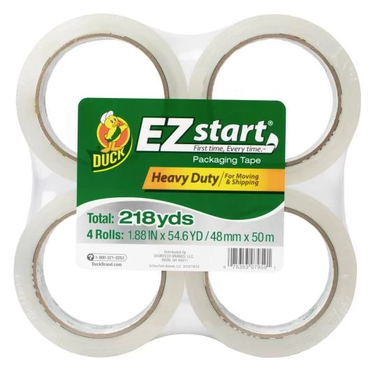 Skip the annoyance of moving and shipping tapes that split or tear. Duck Brand EZ Start Packing Tape is designed to be Frustration-Free so it always unrolls smoothly, easily and quietly. Featuring a long-lasting adhesive, you can keep your boxes and packages secure during shipping, moving and storage. Plus, the tape starts easily off the roll, eliminating the frustration of losing the tape end so you can pack up and leave the stress behind. This crystal clear packing tape unwinds quietly, so it’s perfect to use in the office or at home.