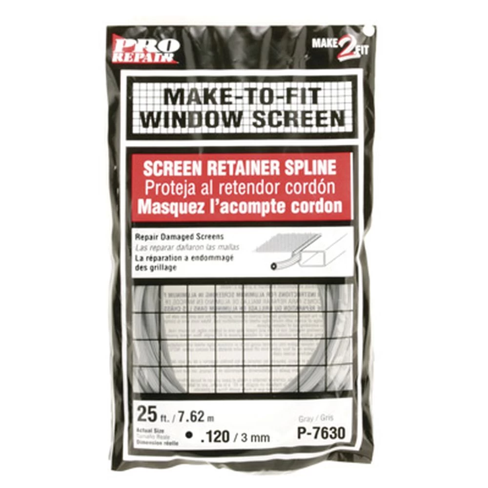 Screen Retainer Spline, .120 Diameter Gray Vinyl Screen retainer spline, top quality vinyl; round, serrated, hollow core; used to hold screen material to window and screen door frames.