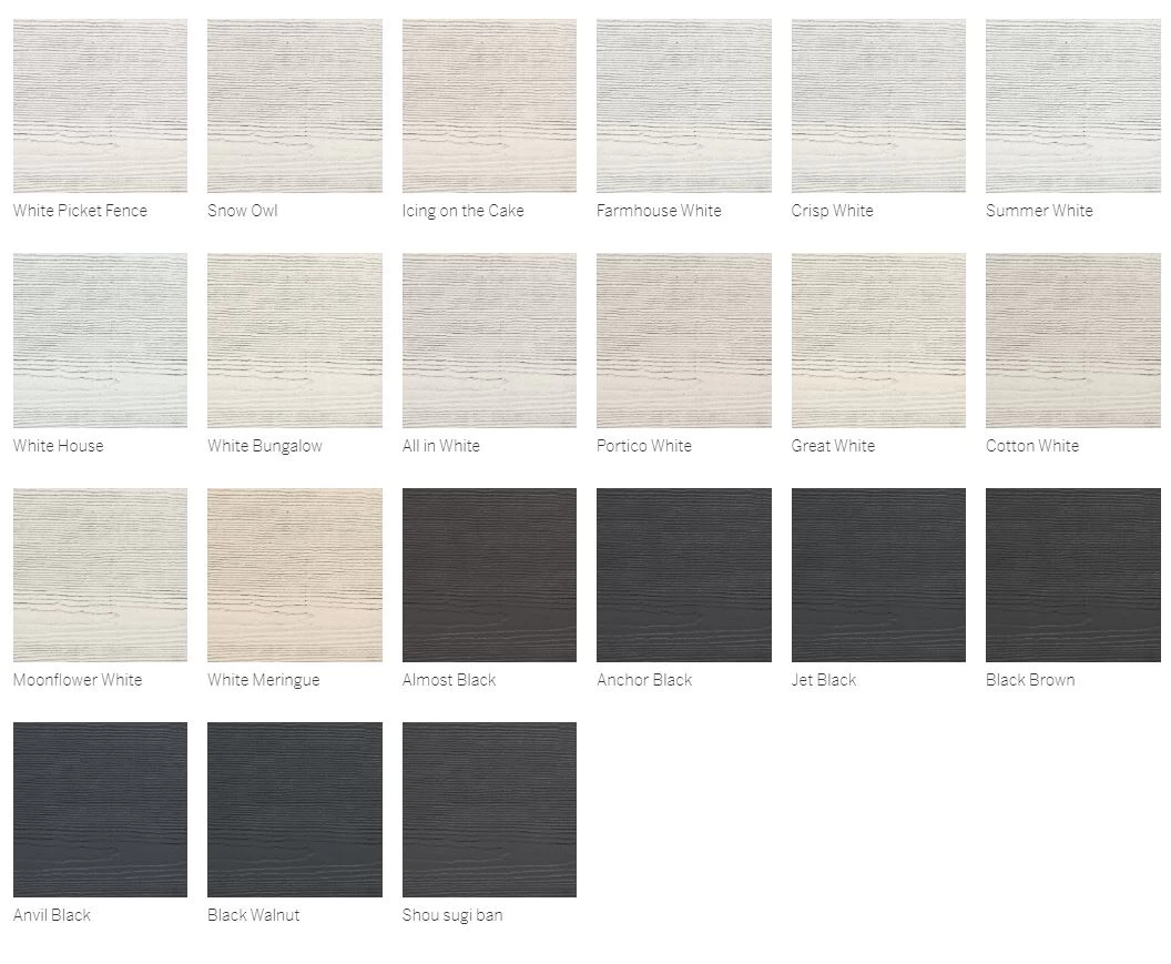 | Color Options | Prime, White Picket Fence, Snow Owl, Icing on the Cake, Farmhouse White, Crisp White, Summer White, White House, White Bungalow, All in White, Portico White, Great White, Cotton White, Moonflower White, White Meringue, Almost Black, Anchor Black, Jet Black, Black Brown, Anvil Black, Black Walnut, Shou sugi ban |