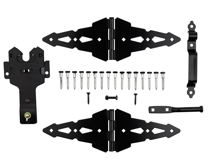 National Hardware Deluxe Latch Decorative Strap Hinge Gate Kit, Heavy-Duty, Specifications: 40 lb Safe Working Load, Steel, Black, Includes: (2) Strap Hinges, Latch with Strike, Pull Mounting Fasteners, (12) 5/16 in x 2 in Hex Screws