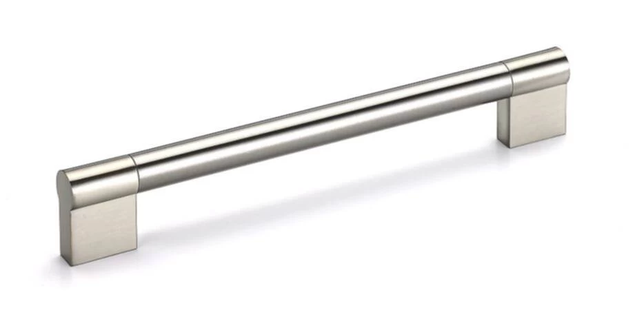 This sleek pull has a tubular stainless steel bar and metal posts to give a modern aesthetic that blends well with any kitchen or bathroom decor.